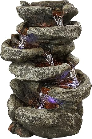 Sunnydaze tabletop water fountain with led lights stacked rocks indoor waterfall feature quiet and relaxing water sound.